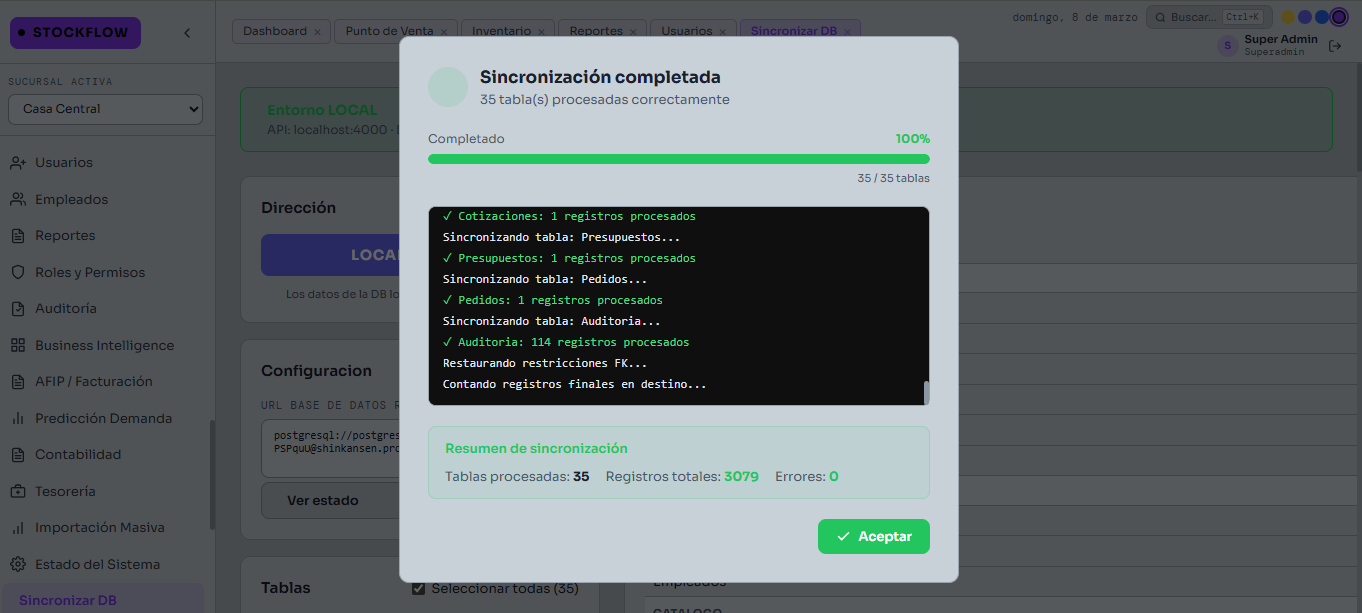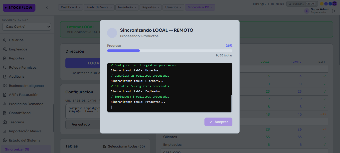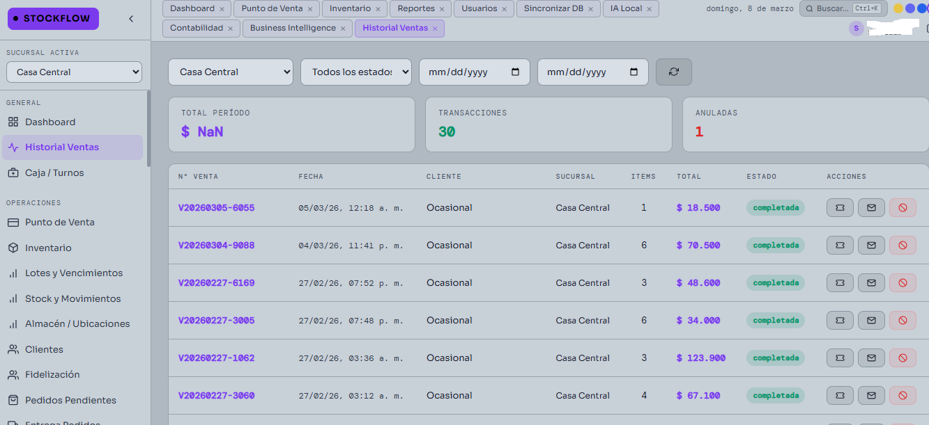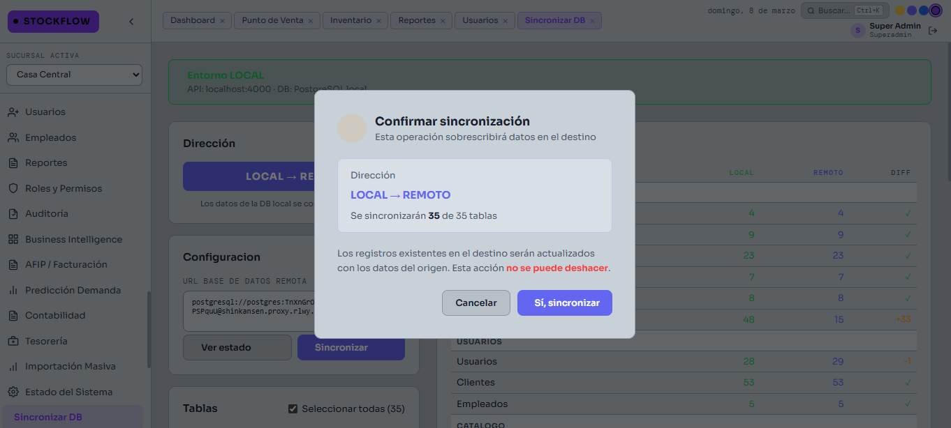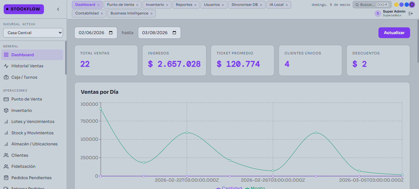 Sí. StockFlow tiene módulo multisucursal con sincronización entre locales, reportes centralizados y control de stock por sucursal.