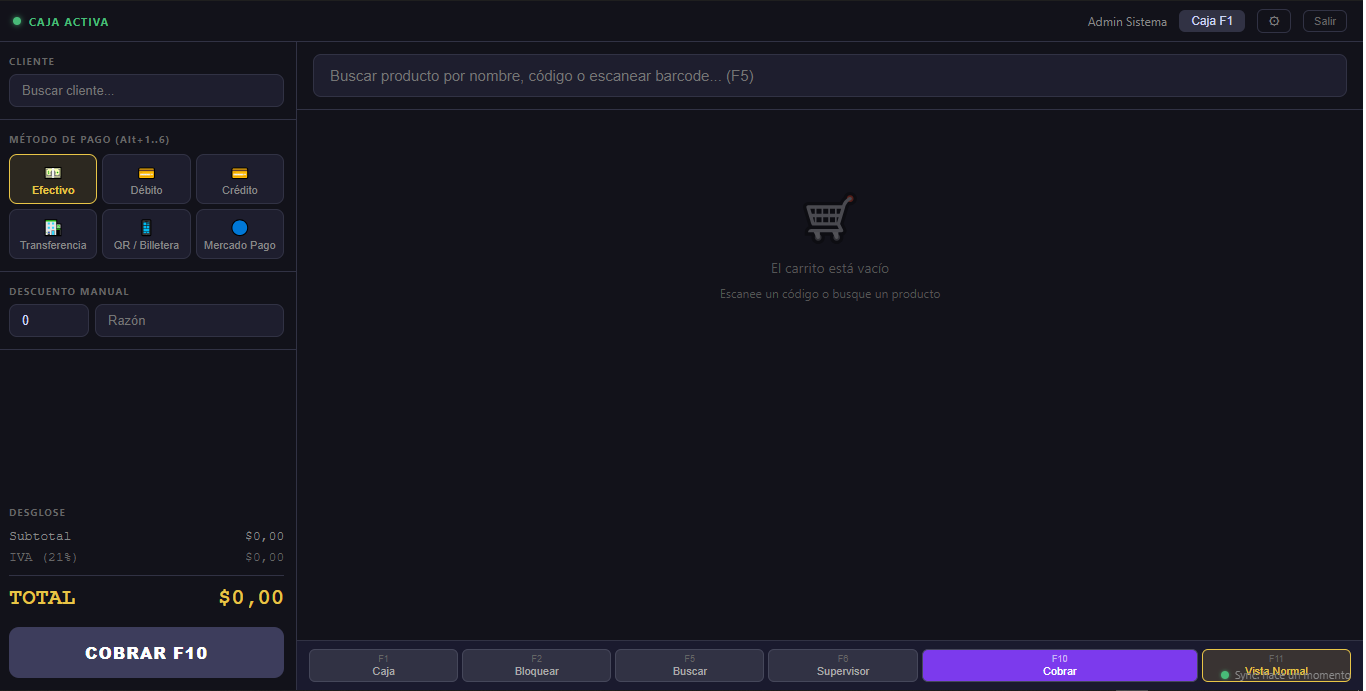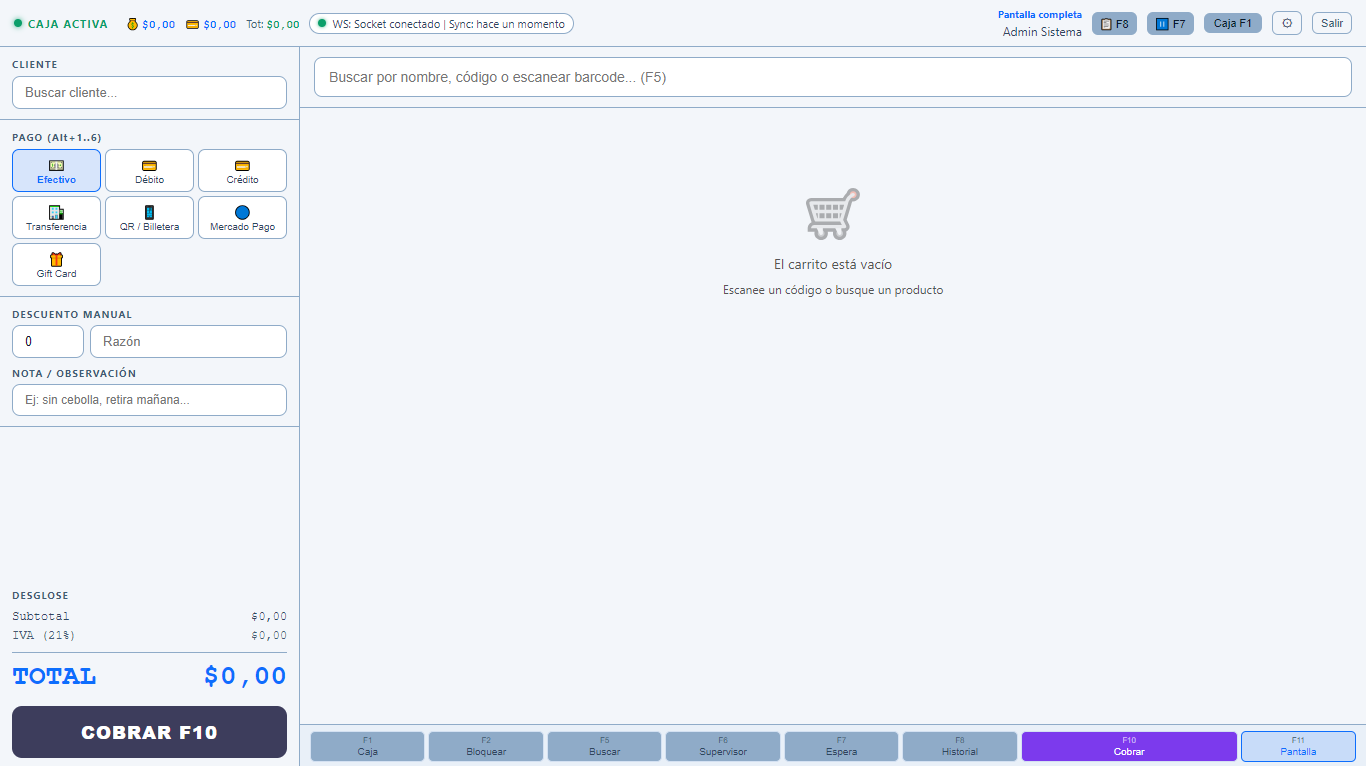 Cobro rápido con lector de código de barras, múltiples métodos de pago, turno de caja y cierre automático.