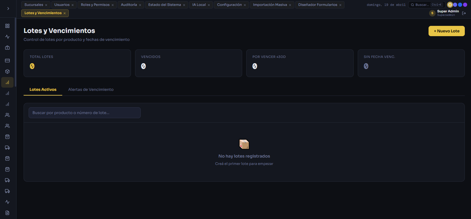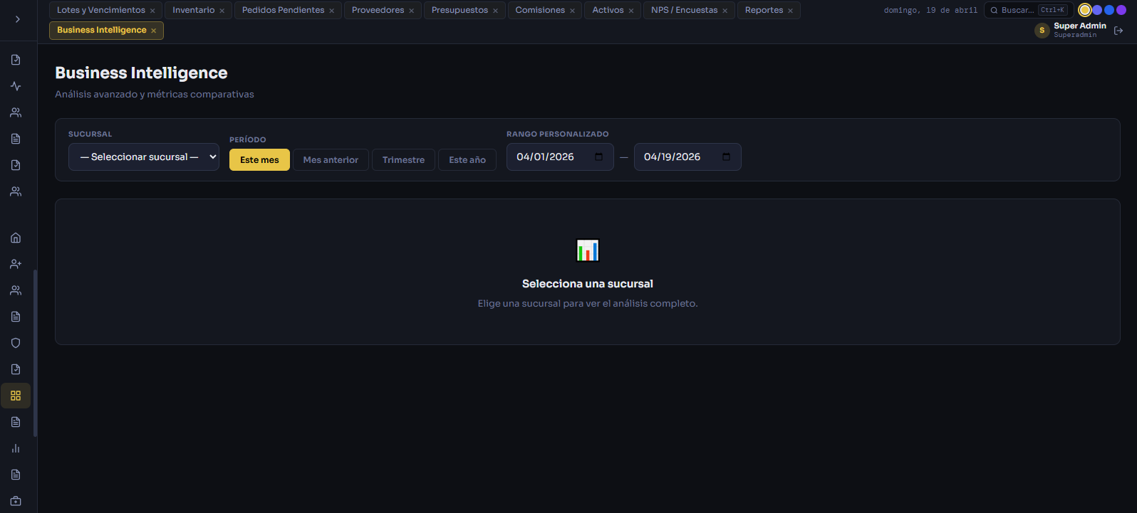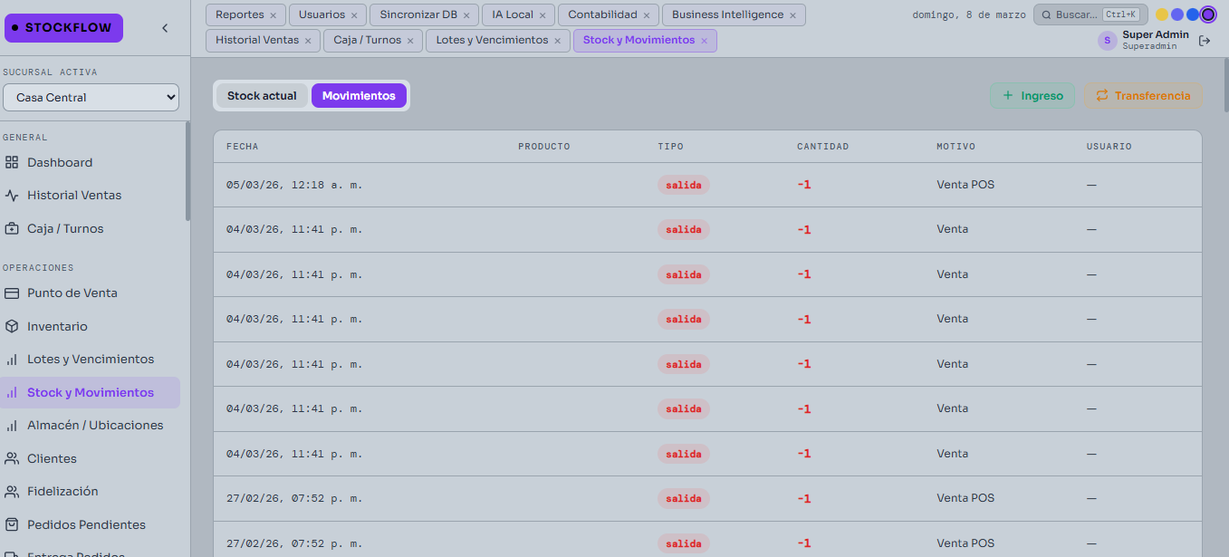 Inventario en tiempo real, alertas de stock mínimo, lotes y vencimientos, movimientos y transferencias entre sucursales.