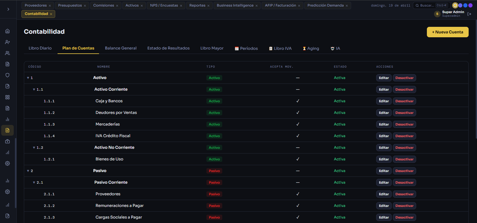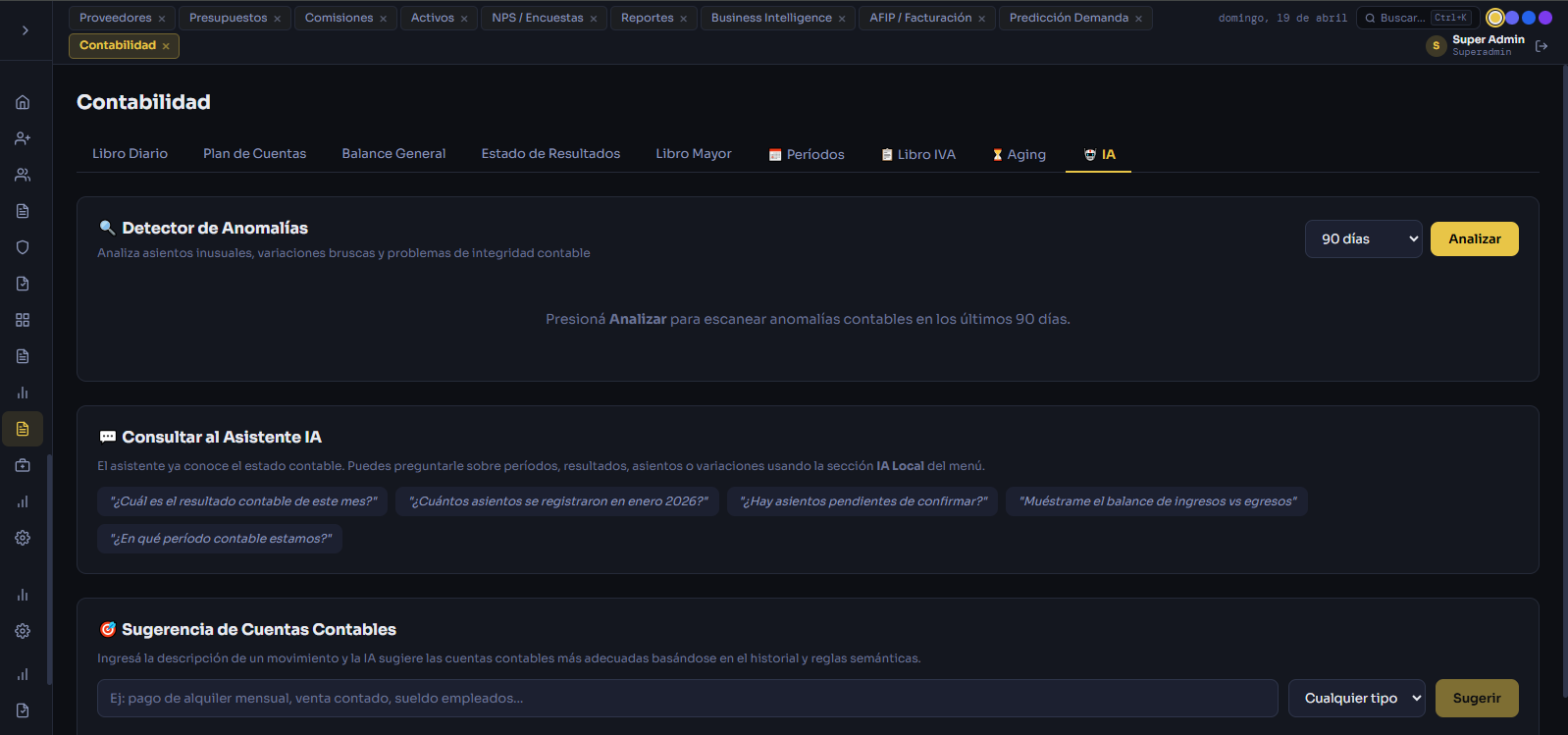 Plan de cuentas, libro diario, balance general, libro IVA y asistente IA para detección de anomalías contables.